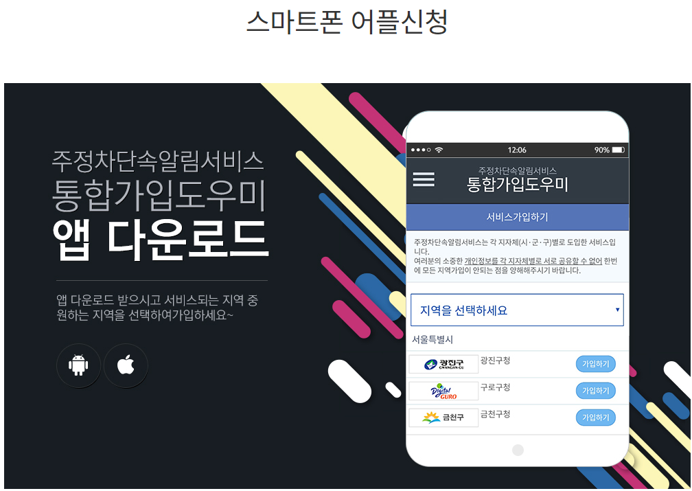 앱을 통해서 핸드폰으로 신청하고 싶다면 '주정차단속알림서비스 통합가입 도우미 앱'을 다운로드해서 신청하면 됩니다.