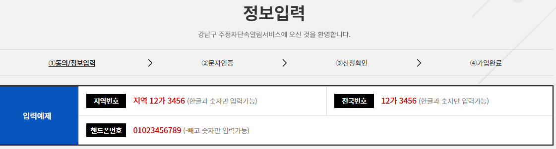 앱 다운로드가 완료되면 알림서비스를 받고 싶은 지역을 선택한 후 차량번호, 성명, 핸드폰번호를 입력하면 신청이 완료됩니다.