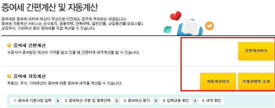 증여세 계산기를 통해서 자동계산을 하고 싶다면 홈택스 모의계산 메뉴에서 증여세 계산기를 이용하시면 편리하게 증여세글 계산해 볼 수 있습니다.
