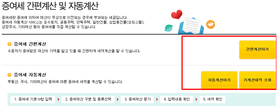 홈택스 증여세 자동계산 프로그램의 경우 부동산, 주식, 기타 재산의 증여에 따른 증여세 세액을 자동으로 계산할 수 있습니다.