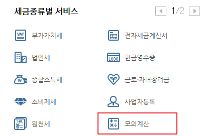 증여세 계산을 우해서 먼저 홈택스 메인 화면에 모의계산 메뉴를 선택하여 '증여세 계산기'로 이동합니다.
