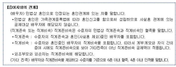 증여가 친족 간에 이루어진 경우라면 증여받은 재산의 가액을 공제받을 수 있습니다. 배우자, 직계존속, 직계비속, 기타 6촌 이내의 혈족이나 4촌 이내의 인척으로부터 증여를 받은 경우 가족관계에 따라 증여세 면제 한도액 차이가 있습니다.