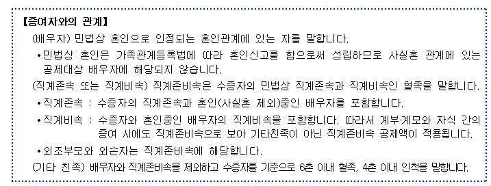 증여세 면제 한도액의 대상은 배우자, 직계존속, 직계비속, 기타 친족입니다.