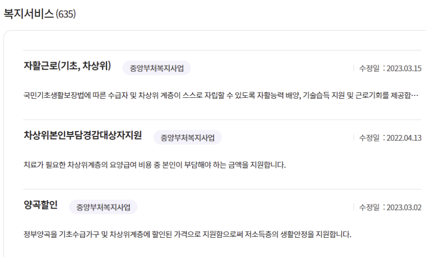 복지로 홈페이지에서 차상위계층 혜택만 검색해 봐도 600개가 넘는 복지서비스를 확인할 수 있습니다.