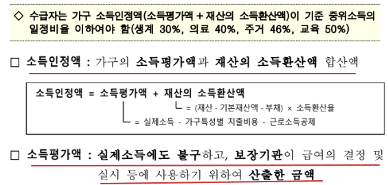 여기서 소득인정액은 소득평가액 + 재산의 소득환산액으로 계산이 됩니다.