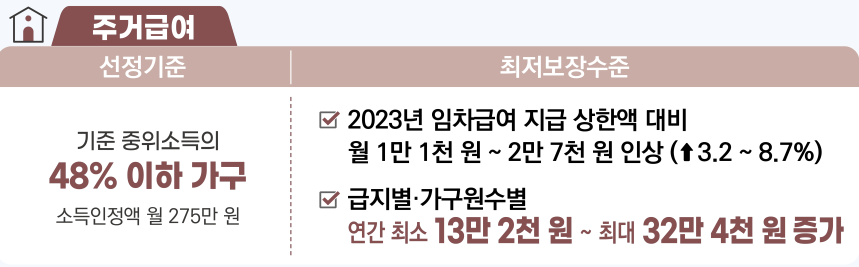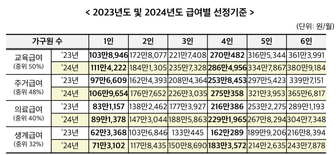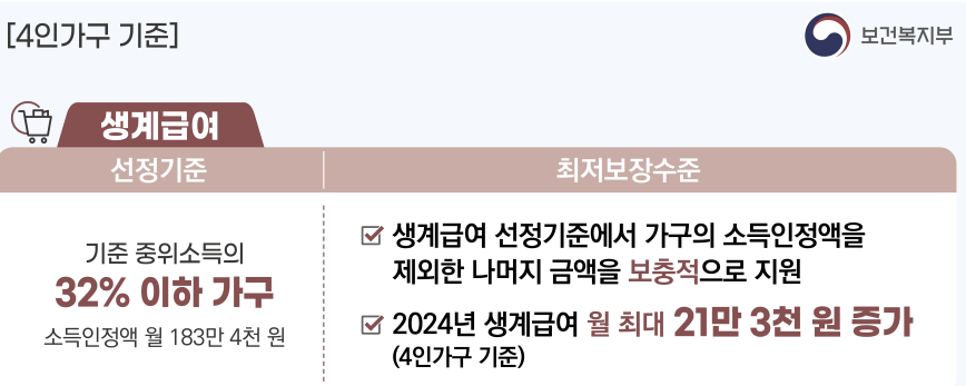 2024년 기준 중위소득에 변경이 되면서 기초생활수급자 생계급여 자격조건도 기준 중위소득 30%에서 2024년에는 32% 이하 가구로 변경되었습니다.